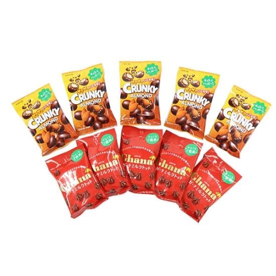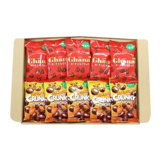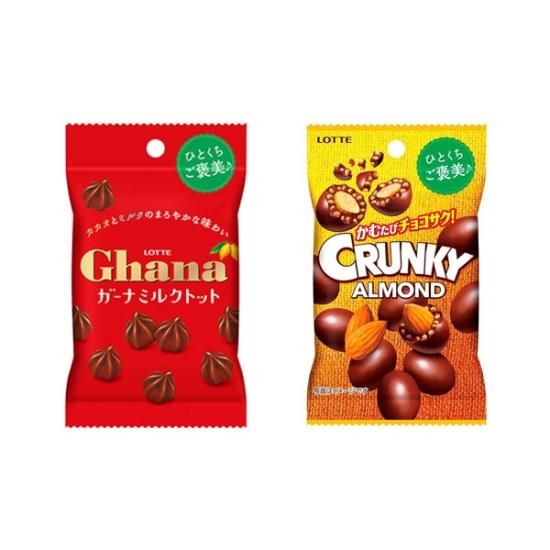 ちょっとした休憩時間にピッタリの小粒で食べやすいガーナミルクチョコレートと、モルトパフのサクサク食感とアーモンドの香ばしいおいしさが同時に楽しめるクランキーアーモンドのセットです。