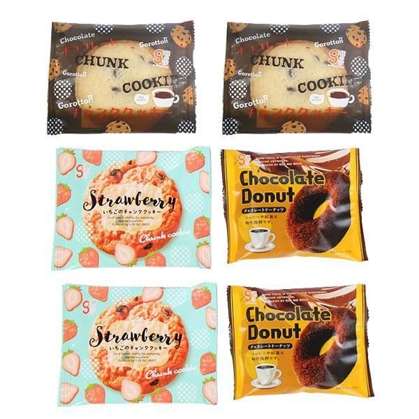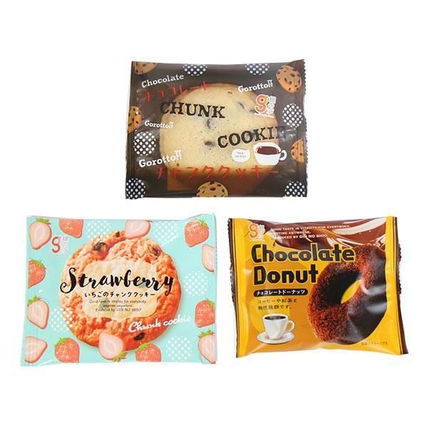 食べ応え抜群の厚焼きのチャンククッキーと、鮮やかな色合いといちごのピンク色が視覚的にも楽しませてくれるいちごのチャンククッキー、チョコレートの豊かな香りが楽しめるドーナツのセットです。