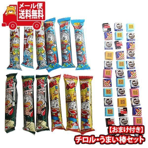 チロルチョコとうまい棒をセットにしました。チロルチョコのフレーバーは4種類(ホワイト&クッキー・ミルク・ビス・アーモンド)です。味の中身はランダムとなります。