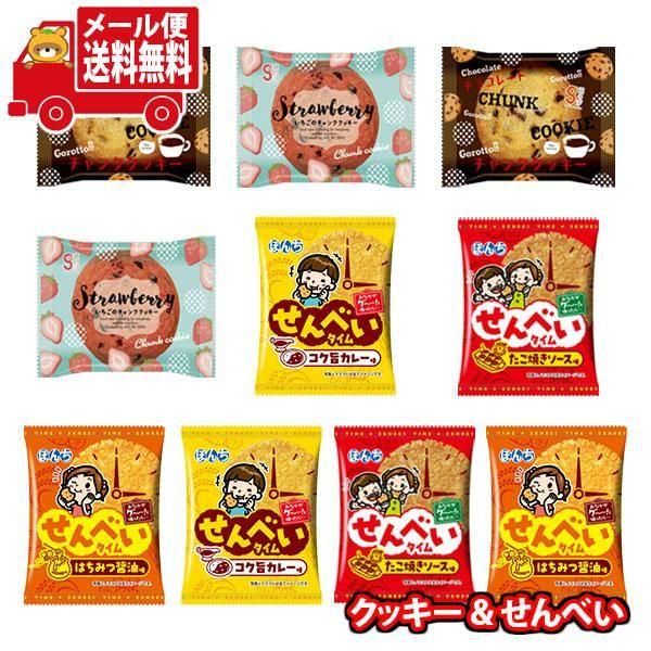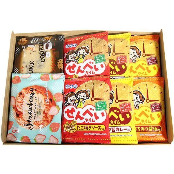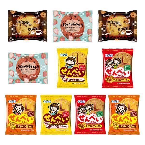 ぼんちせんべいタイムシリーズ3種と、見た目のかわいらしさが際立つチャンククッキーのセットです。