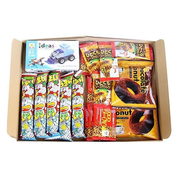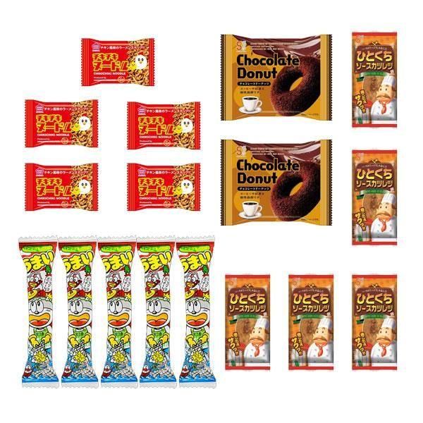 うまい棒やチョコレートドーナッツ、ソースカツレツなどのお菓子のセットです。