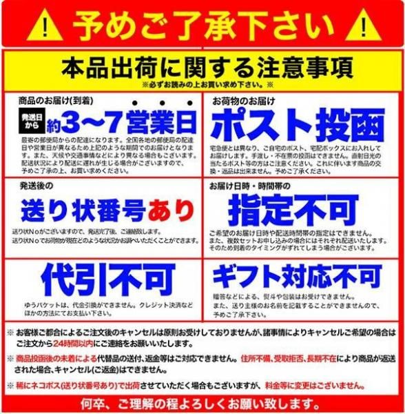 ・商品投函後の未着による代替品の送付、返金等はご対応できません。住所不備、受取拒否、長期不在により商品が返送された場合、キャンセル(返金)はできません。