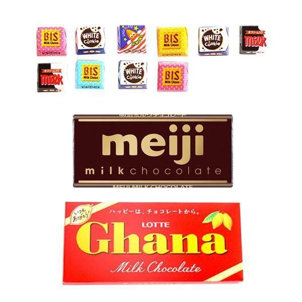 4種類のチロルチョコが楽しめるチロルチョコと、ガーナミルクチョコレート、明治ミルクチョコレートのセットです。