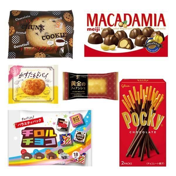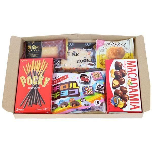 4種の味が楽しめるチロルチョコと、グリコのポッキーチョコレート、、明治マカダミアチョコレートなどをセットにしました。